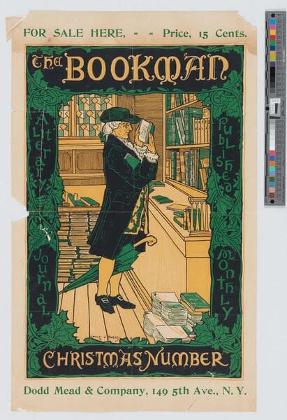 - Image of an advertisement for The Bookman 1895 Christmas Number featuring a man standing in front of a bookshelf reading while holding an umbrella between his knees; books and papers are stacked on the floor in the foreground and background; decorative frame made up of holly.
