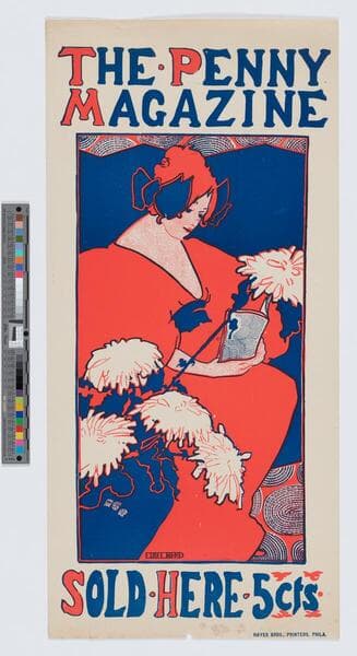 - Image of an advertisement for the Penny magazine featuring a seated woman reading next to several large flowers.