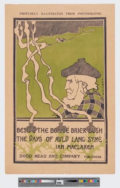 - Image of an advertisement for Beside the Bonnie Brier Bush by Ian MacLaren featuring a bust-length image of a Scotsman wearing a plaid mantle and tam hat; fields with road and buildings in background; wisps of smoke rising from three thistle flowers at bottom center.
