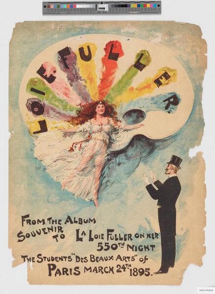 - Image of an angel with a large artist's palette for wings hovering in the sky above an older man with a white beard wearing a top hat and tails.