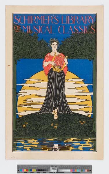 - Image of an advertisement for Schirmer's library of musical classics featuring a woman standing playing a lyre.