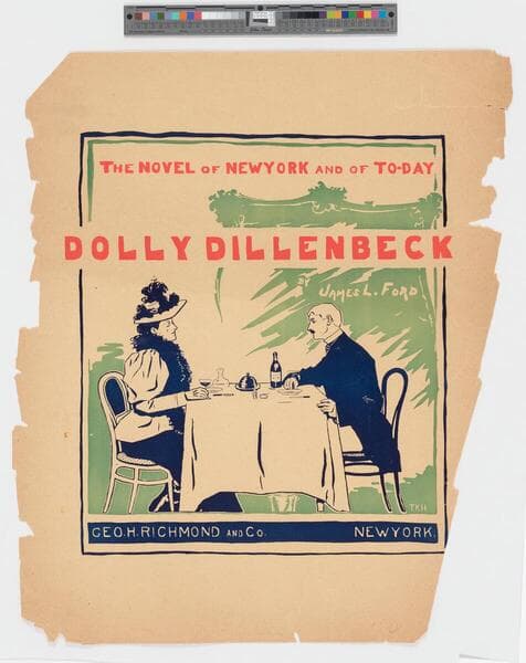 - Image of an advertisement for Dolly Dillenbeck by James L. Ford featuring a man and a woman sitting at a cafe table sharing a meal.