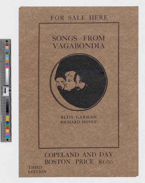 - Image of an advertisement for Songs from Vagabondia by Bliss Carman and Richard Hovey featuring the faces of three men in the dark portion of a crescent moon.
