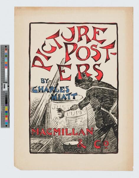 - Image of an advertisement for the book Picture Posters by Charles Hiatt featuring a man pasting a poster to a barrel.