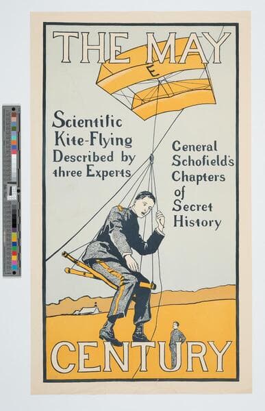 - Image of an advertisement for the Century magazine May 1897 issue featuring a man flying an early aeronautics kite while another watches from the ground below.