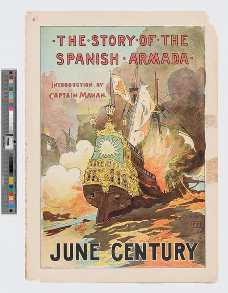 - Image of an advertisement for The Century June 1898 issue featuring a ship from the Spanish Armada under attack.