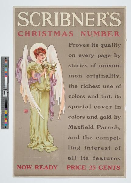 - Image of an advertisement for Scribner's Christmas 1901 issue featuring an angel holding a candle with holly in each hand.