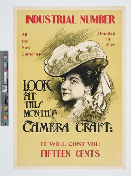 - Image of an advertisement for Camera Craft Industrial Number featuring a bust-length portrait of a woman turning towards the camera wearing an elaborate hat.