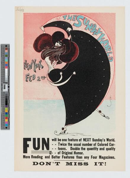 - Image of an advertisement for the New York Sunday World featuring a woman ice skating wearing a black mask and a long black skirt.