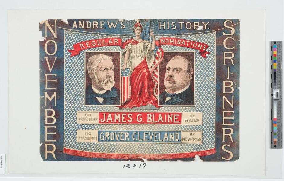 - Image of an advertisement for the Scribner's November 1896 issue featuring goddess Columbia holding a Union shield and American flag between portraits of James G. Blaine and Grover Cleveland; patterned banner with fringe in background.