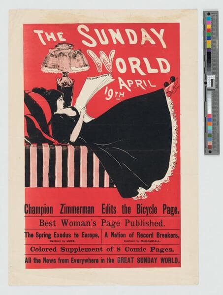 - Image of an advertisement for the New York Sunday World featuring a woman reclining on a chaise lounge with her feet in the air reading an issue of the Sunday World.