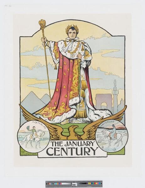 - Image of an advertisement for The Century January 1895 issue featuring Napoleon Bonaparte standing in regal fur-trimmed cloak holding a staff and sword above an eagle insignia; triumphant Napoleon on horseback at Austerlitz and defeated Napoleon at Waterloo inset in circular frames at bottom left and right.