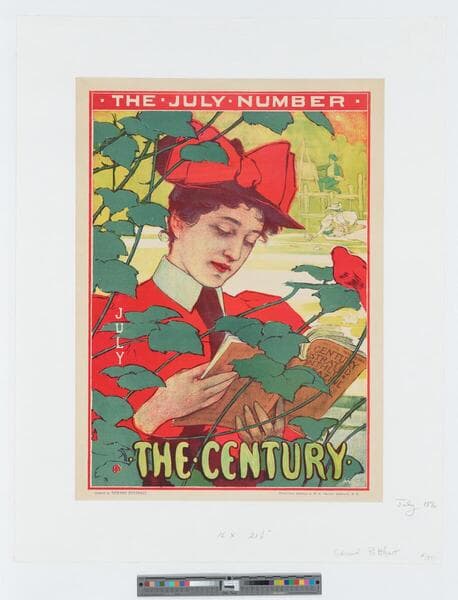 - Image of an advertisement for The Century July 1896 issue featuring a woman reading the issue outdoors near vines with a red bird perched near her shoulder; a man paints and a woman sits picking flowers in the background at right.