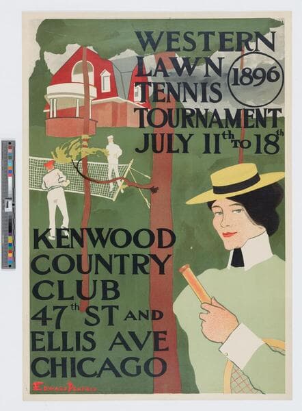 - Image of an advertisement for a lawn tennis tournament at Kenwood Country Club in Chicago, Illinois, featuring a woman wearing a high-necked tennis costume holding a racquet under her arm; two men play tennis on the lawn in front of a large building in background at left.