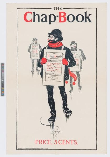 - Image of an advertisement for the Chap-Book December 1895 issue featuring three men standing holding posters in the cold; the center man clearly has a red chapped face, torn pants, and holes in his shoes.