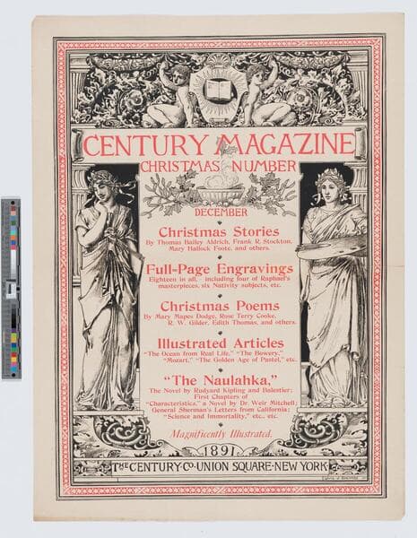 - Image of an advertisement for The Century Christmas Number featuring women in Classical garb and small children flanking an open book as parts of an elaborate decorative border.