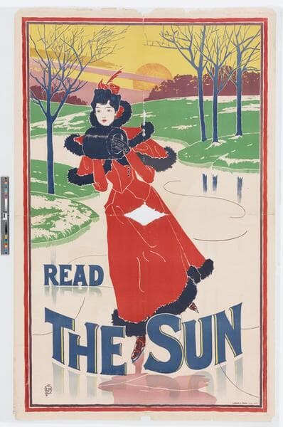 - Image of an advertisement for The Sun featuring a woman wearing a long fur-trimmed dress and fur muff ice skating on a pond in a snowy forest.