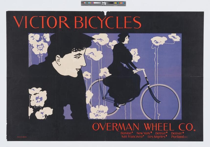 - Image of an advertisement for Victor Bicycles featuring a man looking admiringly over his shoulder at a woman riding a bicycle; flowers in background.