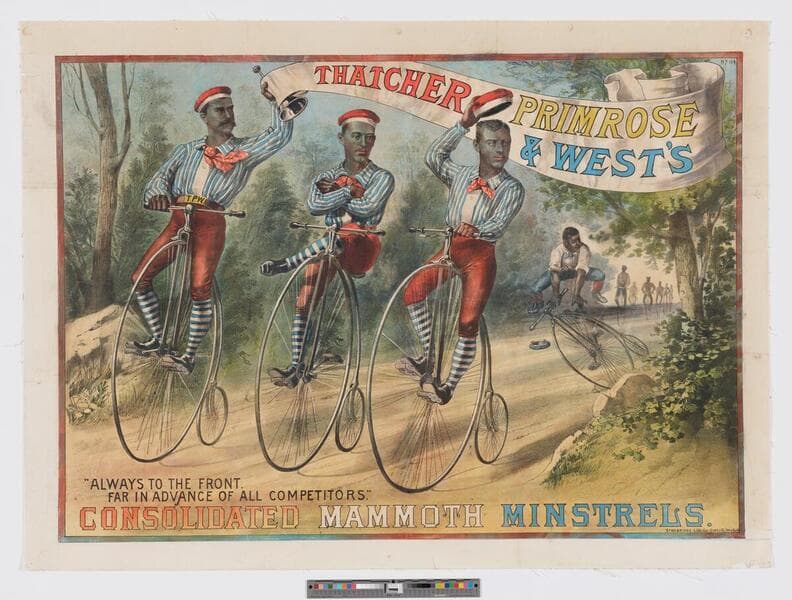Image of an advertisement for Primrose & West's minstrel show featuring dozens of performers in blackface riding bicycles along paths behind Primrose and West themselves; a dog and some chickens flee in the foreground; man holding banner at center that reads, "Always Up To Date."