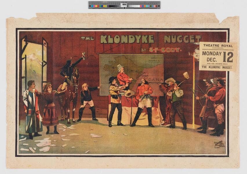 Image of a central image of a portrait of William F. Cody as Buffalo Bill sitting at a campfire in a frontiersman costume with a rifle and saddle, surrounded by eight vignettes of different dramatic scenes including a street parade with a horse-drawn cart labeled "Buffalo Bill To Night"; Cody digging at a hill with a knife in the wilderness with the caption "Buried Alive"; Cody holding up the head of a young injured man with the caption "He Still Lives"; a farmer sleeping on a plow pulled by two oxen while holding a book of the "Life of Buffalo Bill" while images of caricatured Native American Indians and a man hanging by a noose while another is burned at the stake appear in his dreams, captioned "The Farmer's Dream"; Cody on horseback cutting the rope of a hangman's noose from a young man’s neck who hangs from a tree, captioned "Whose Picnic Is this?"; a parlor scene where a man is shot while others look on, captioned "The 20 days are up, and my pledge fulfilled"; a man in a fistfight with Cody in the parlor and wielding a knife, captioned "Keep Cool Pard."; and Cody riding on horseback through the plains while a fire burns in the distance and a battle with Native American Indians on horseback goes on; with images of a bison with the caption "Diamond Pin with Diamond Eyes," at bottom of central image, and an eagle that holds a medal that reads "Congress to W. F. Cody Buffalo Bill Scout & Guide" at top; the poster advertises the melodrama "20 Days or Buffalo Bill's Pledge" (also known as "Twenty Days or Buffalo Bill's Pledge") and includes printed date information for performances beginning on December 11, [1882], at the Walnut Street Theatre in Philadelphia, Pennsylvania.