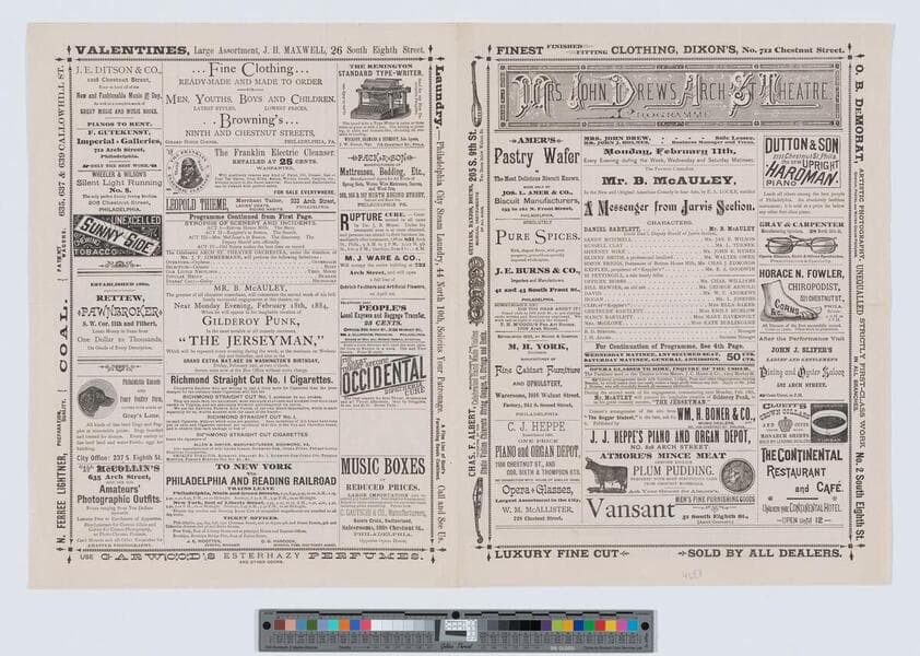Image of a program for A Parisian Romance at Mrs. John Drew's Arch St. Theatre of Philadelphia, Pennsylvania, featuring information about upcoming programs and performances as well as product advertisements.