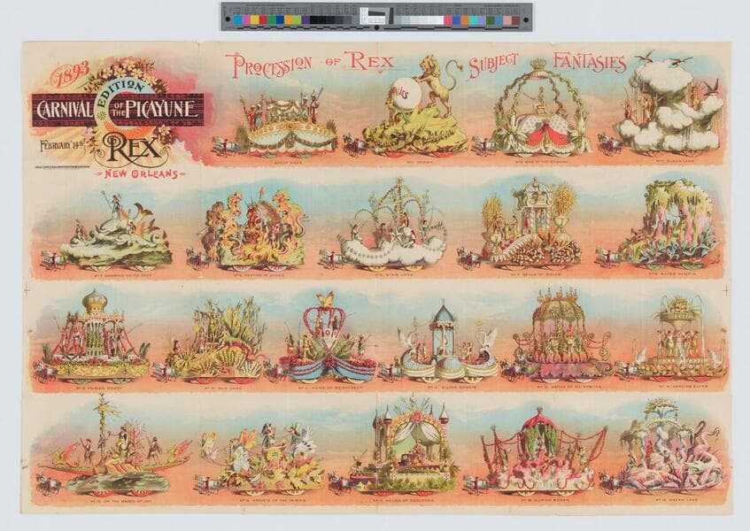 Image of a depiction of the Rex procession held in New Orleans, Louisiana, on March 1, 1892, published in a special carnival edition of the Picayune; nineteen floats pulled by horses with color themes are presented in four panels; newspaper columns and advertisements on verso.