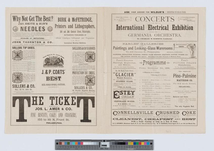 Image of a program for A Parisian Romance at Mrs. John Drew's Arch St. Theatre of Philadelphia, Pennsylvania, featuring information about upcoming programs and performances as well as product advertisements.
