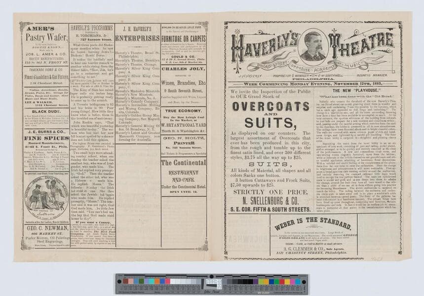 Image of a program for Haverly's Theater of Philadelphia, Pennsylvania, featuring information about upcoming programs and performances as well as product advertisements, including a large piano advertisement; bust-length portrait of proprietor J.H. Haverly at top center.