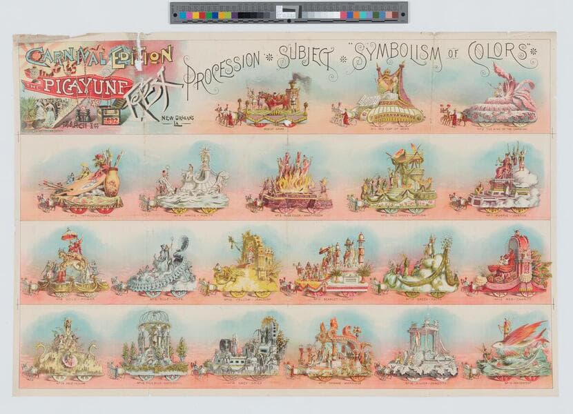 Image of a depiction of the Mistick Krewe of Comus procession held in New Orleans, Louisiana, on March 1, 1892, published in a special carnival edition of the Picayune; twenty floats pulled by horses with Japanese-inspired themes and mythological figures are presented in four panels; newspaper columns and advertisements on verso.