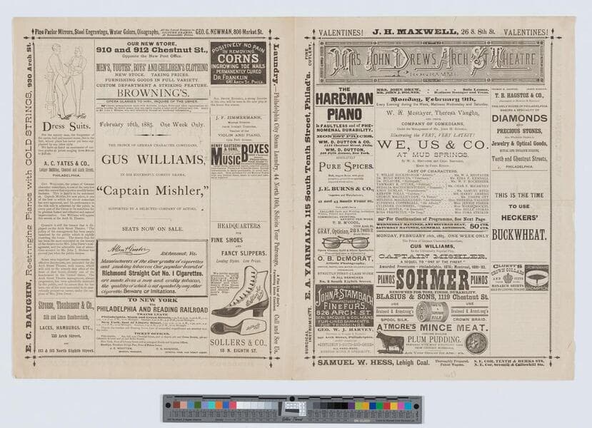 Image of a program for A Parisian Romance at Mrs. John Drew's Arch St. Theatre of Philadelphia, Pennsylvania, featuring information about upcoming programs and performances as well as product advertisements.