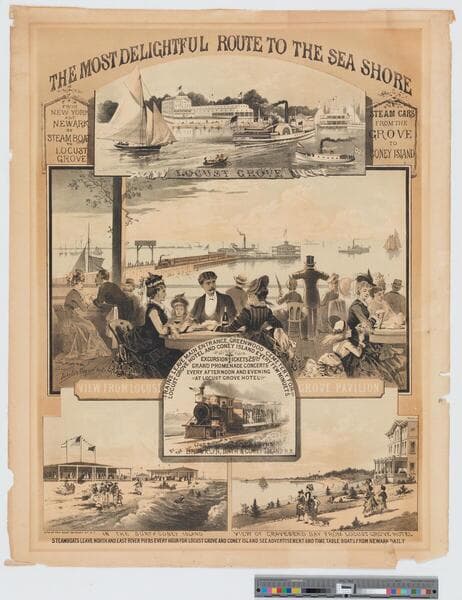 Image of an advertisement for John H. Starin's island excursions. Includes perspective views of Manhattan Beach Hotel and the Oriental Hotel, as well as images of Starin's resorts at Alpine Grove, Glen Island, and New Rochelle. The central image depicts an image of Starin’s fleet of ships and steamboats on water, and other imagery includes people traveling to destinations on boats. Located on the left and right edges of the poster are two waving flags representing Star-in’s personal flag, abbreviated with a symbol of a star in place of lettering for his name.