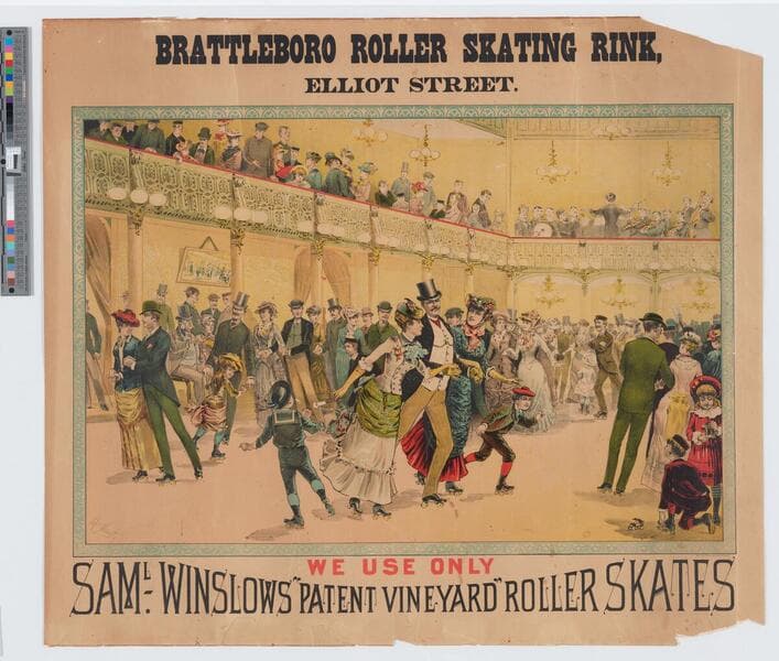 Probable date based on history of when Muncie Skates were manufactured and advertised. Thad A. Neely patented the Muncie roller skate model in 1882. Advertisements appear on Newspapers.com from 1883 for the Muncie adjustable skate. Printer, J.M.W. Jones was active from 1867-1905. "We Use the Muncie Skate of Muncie, Ind." --text, top of print. "Grand Roller Skating Assemblies." --text, bottom of print. "Lith. by the J.M.W. Jones S&P. Chicago." --text, center, bottom of margin.