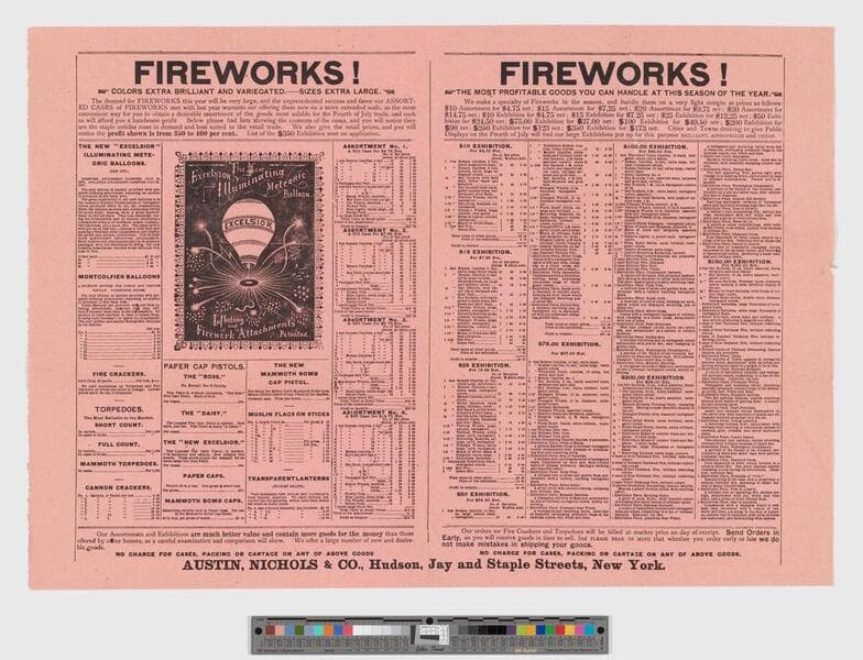 Image of a leaflet by retailer Austin, Nichols & Co. listing different types of fireworks for sale. The right side of the print lists more gunpowder related products sold by the retailer, from firecrackers, hot air balloons, to pistols and more. The right of the print also includes two images of pistols pointed at one another, a paper cap pistol titled 'The Boss,' and a blank cartridge pistol. Towards the bottom of the right is an image titled "The New Excelsior Illuminating Meteoric Balloon - Inflating and Firework Attachments." The image depicts a hot-air balloon shown flying up, surrounded by lit fireworks.