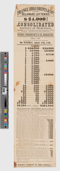 Image of a broadside listing information about lottery prizes, rewards, and ticket pricing for a lottery drawing taking place on July 31st, 1860 in Wilmington, Delaware. Whole tickets for the drawing are sold for five dollars, half tickets for two dollars and fifty cents, and quarter tickets for one dollar and twenty-five cents. The scheme on the print also lists totals of "32.396 prizes, ... amounting to $281.861." The rewards and title information are printed in bold. Towards the bottom of the print is an image of two hands shown pointing at text listing the rules of the lottery.