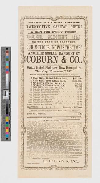 Image of a broadside in red and blue colors listing information about a lottery drawing organized by L.D. Sine that took place in St. Louis, Missouri on January 1, 1874. The print includes information about the different types of prizes awarded to winners, ranging from cash, gold, silver, watches, bracelets, silverware, utensils, tea sets, and other materials. Text on the print includes information about ticket prices, the total number of gifts available, and lists precautions for purchasing tickets from agents. In the middle of the decorative title on recto is a decorative image of a blind-folded young man holding up a piece of paper while spinning the lottery wheel. Image is surrounded by decorative scrollwork. Top of verso includes a section labeled, "Manner of Drawing," describing how the lottery drawings are called and what the process entails. Shown in this section is an engraving of a blindfolded young man with one hand on a lottery wheel, and the other holding up a piece of paper. Another man is seated near him by a desk, writing down the called lottery numbers. A crowd of people surround them, watching the drawing process. The rest of verso includes a detailed list of gifts to be drawn at the event. Both recto and verso include a red decorative border.