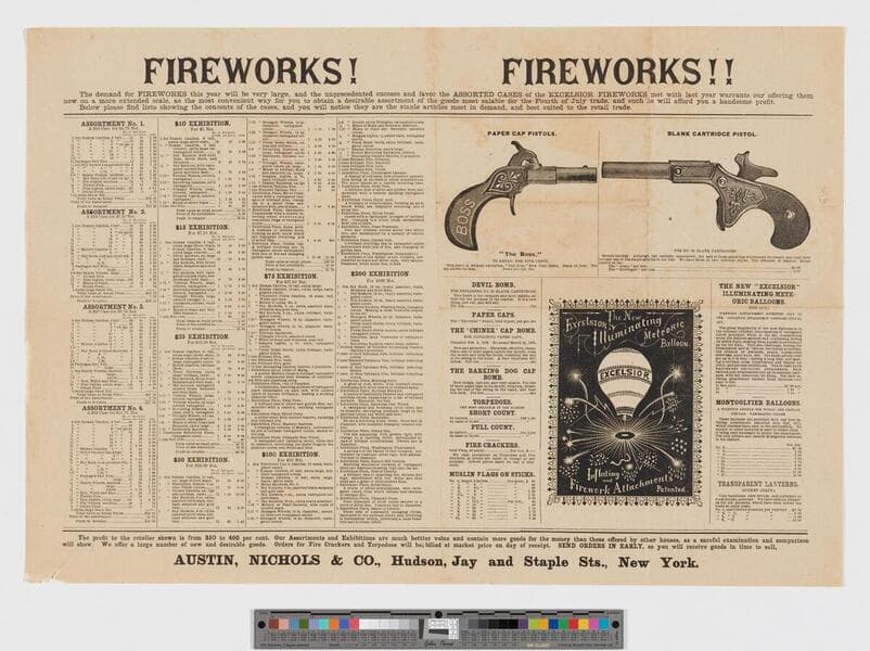 Image of a pamphlet by retailer Austin, Nichols & Co. listing different types of fireworks, firecrackers, meteoric balloons, pistols, and more gun powder related products for sale. Towards the top center of the left page is an image titled "The New Excelsior Illuminating Meteoric Balloon - Inflating and Firework Attachments." The image depicts a hot-air balloon shown flying up, surrounded by lit fireworks.