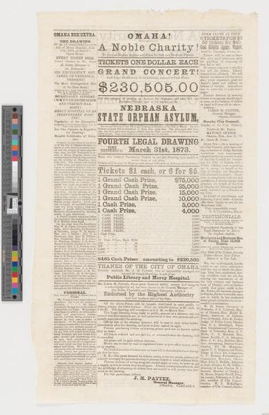 Image of a broadside listing information about a charity drawing organized by J.M. Pattee taking place on April 29, 1875 in Laramie City, Wyoming. Information about the charity event is printed on both sides of the broadside and there are three columns of text on each side. Prizes for the lottery total up to $350,000. Columns surrounding the print include promotional information about Pattee, testimonials, endorsements, and information about the humanitarian intent of the drawing. Verso includes more promotional statements about the charity drawing, lists names of former lottery winners, and includes advertisements for the American Gold and Silver Mining Co. (scam company run by Pattee), and Lohman & Co.’s Indian Blood Purifier product.