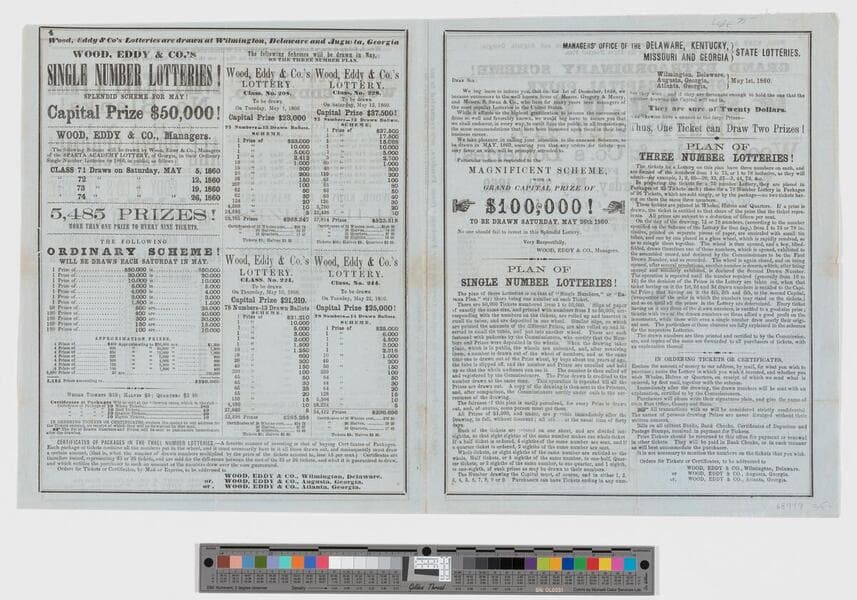 Managers' office of the Delaware, Kentucky, Missouri and Georgia state lotteries. Wilmington, Delaware; Augusta, Georgia; Atlanta, Georgia, May 1st, 1860