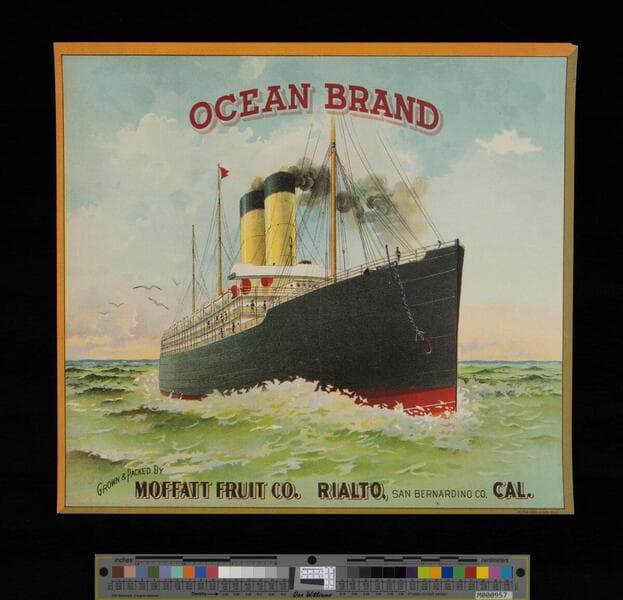 Image of a three propeller monoplane over water with seagulls and ship in background; wrapped Sunkist orange logo at lower left.
