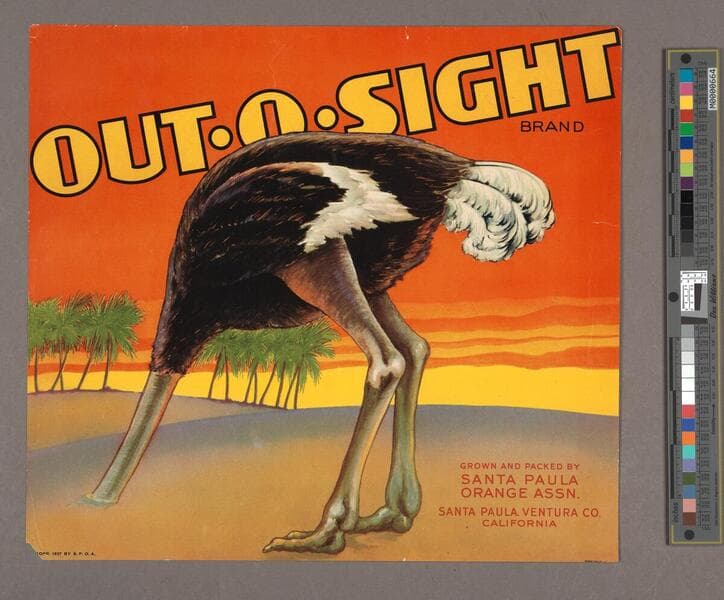 - Image of an ostrich with its head in the sand; palm trees and sunset in background.