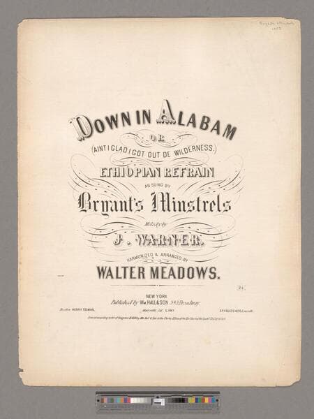 Down in Alabam, or, Aint I glad I got out de wilderness : Ethiopian refrain / as sung by Bryant's Minstrels ; melody by J. Warner ; harmonized & arranged by Walter Meadows