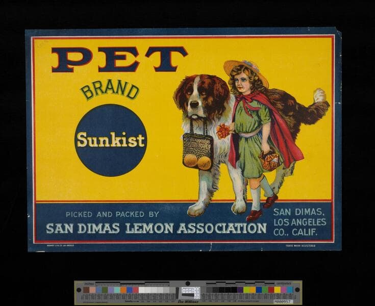- Image of a girl wearing a sun bonnet and red cape, carrying a bouquet of flowers and a small basket, and walking with a St. Bernard dog carrying a mesh bag with two lemons; Sunkist blue circle logo at left.