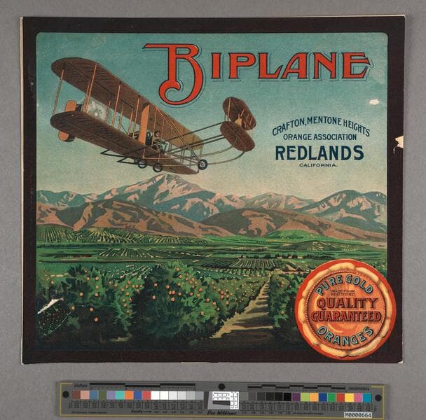 - Image of a biplane flying over orange groves with mountains in background; Pure Gold Oranges logo at lower right.