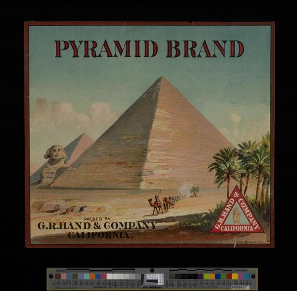 - Image of a camel caravan in front of two pyramids with a Sphinx between; G. R. Hand & Company hand-in-triangle logo at lower right.
