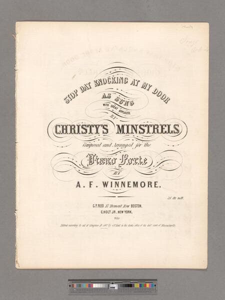 Stop dat knocking at my door / as sung with great applause by Christy's Minstrels ; composed and arranged for the piano forte by A. F. Winnemore
