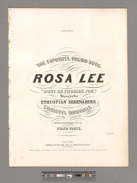Rosa Lee, or, Don't be foolish Joe / sung by the Ethiopian Serenaders, Christy's Minstrels, and others ; arranged with chorus & accompaniments for the piano forte