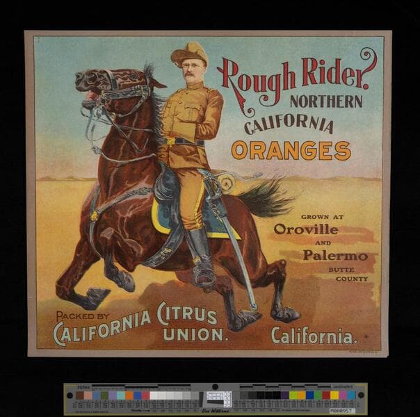 - Image of Teddy Roosevelt as a cavalry Rough Rider in his military uniform and riding his horse, Little Texas.
