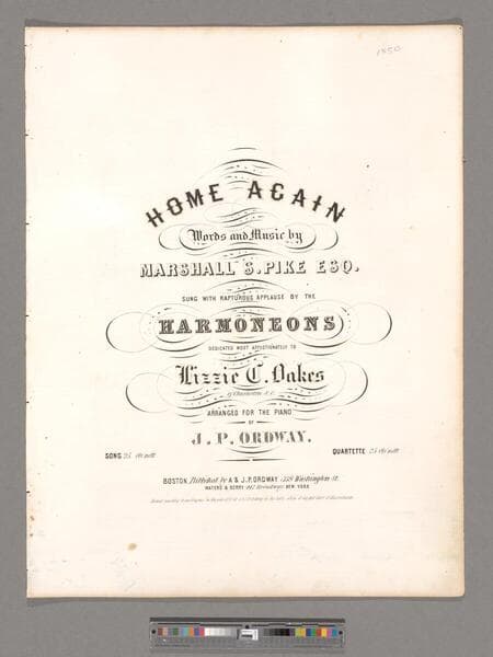 Home again / words and music by Marshall S. Pike Esq. ; sung with rapturous applause by the Harmoneons ; arranged for the piano by J. P. Ordway