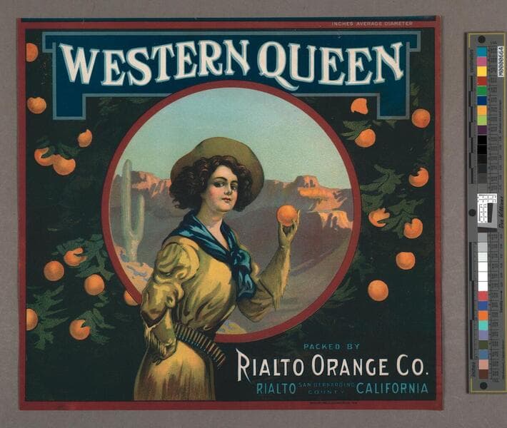 - Image of a woman in Western cowgirl dress, hat, and belt of bullet ammunition holding an orange; oranges and leaves design in background; circle window view of desert canyons and a cactus.