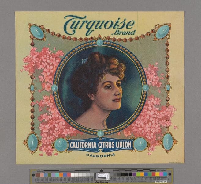Image of a profile view of Native American man wearing full headdress, shoulders up, in an oval frame, surrounded by lemons, leaves and blossoms; Sunkist Lemons sunburst logo at lower right.